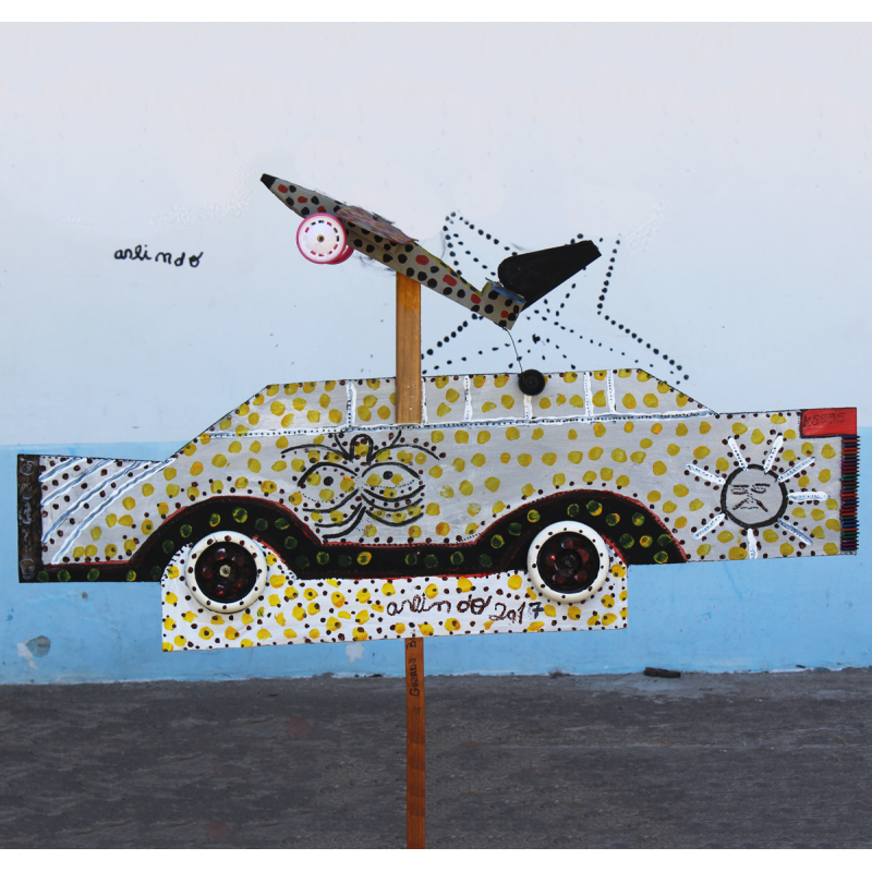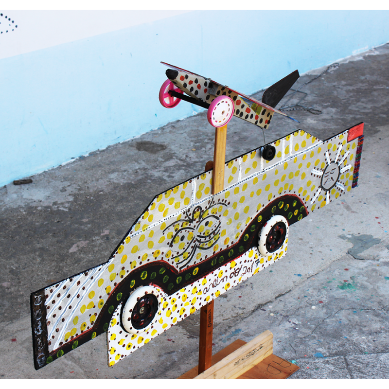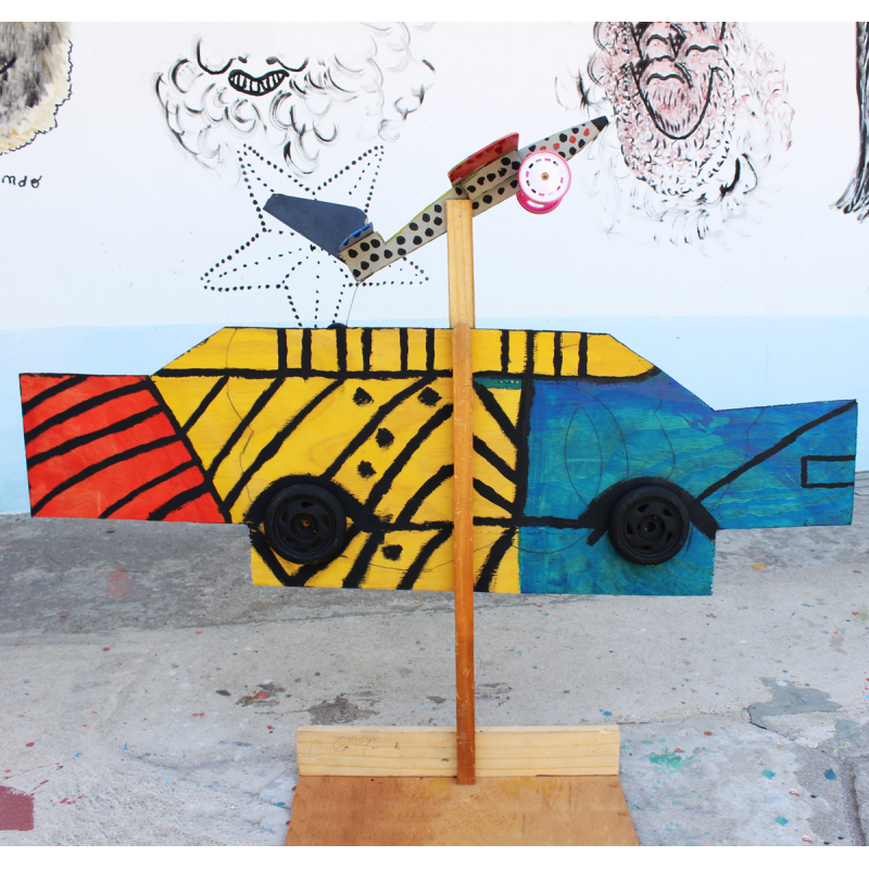 Madeira, rodas de brinquedo, tinta acrílica.