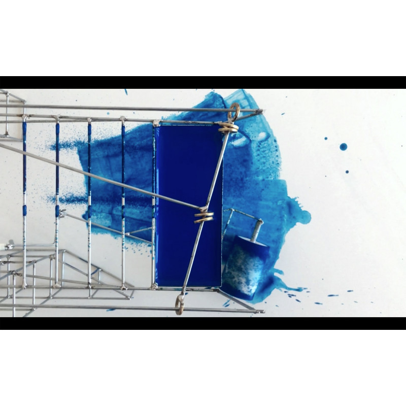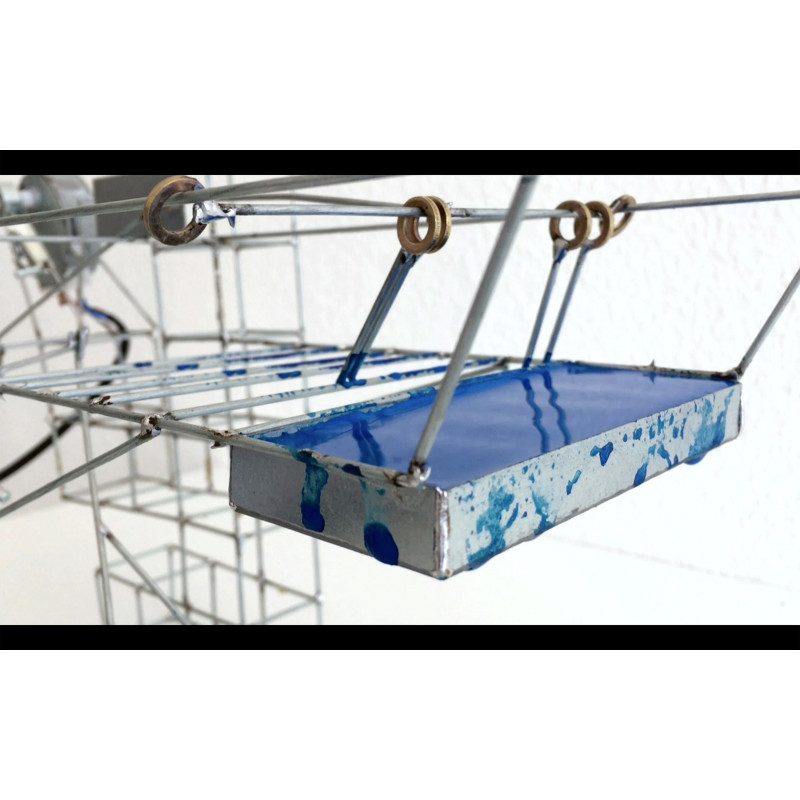 "Prototype I" is a two-mechanism system where one is responsible for dripping or raining the paint and the other in manipulating it. The paint drops fall as a result of the vibration with the grid generating a particular sound. The roller is responsible for spreading the paint intervening the gesture of the upper mechanism. According to the artist, "one part speaks and the other tries to silence it". (Silugramo)