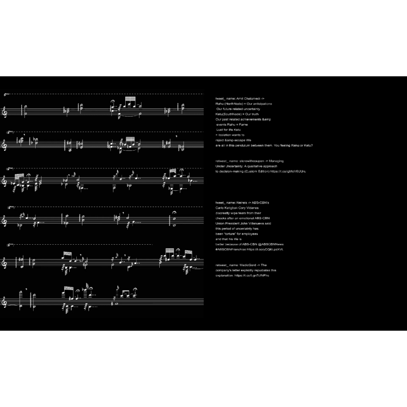 Em" Uncertainty", os tweets primeiro desencadeiam a criação da composição, barra por barra. Uma vez que a maioria das barras são dispostas, o solista começa a tocar, enquanto os tweets fazem com que a pontuação oscile entre uma versão final e outra menos ritmicamente. e forma melodicamente refinada. A pontuação em si é influenciada pela incerteza, que a aciona e impede que ela atinja uma aparência definida ". (Nicola Privato)