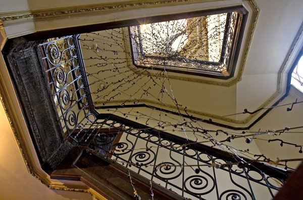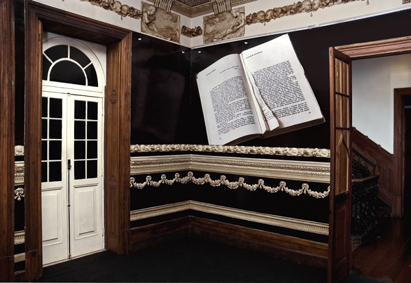 The conceptual construction of space always comes from the idea that its objects and books have the ability to transform the environment where they are installed into that which relates to its primeval nature. Therefore the intervention tends to reanimate the rooms, going back to them, recreating them: Biblioteca encarnada(Incarnate library), Sala em branco(Blank room), Biblioteca negra(Black library), Corredor para a carta evanescente(Corridor to the evanescent letter), Quarto do oráculo (Room of the oracle), Varanda(Balcony), Quarto do sonho (Dream room), Quarto do tempo (Time room), and Conversa na escadaria(Conversation in the staircase). Of course, we could think of a conversation that really took place in the house, but this would be a type of memory, which is not the case. It would be better to talk about symptom, about a bunch of conversations or accounts of the house itself, about symbolic inscriptions that blossom in the body of the house: the incarnate letter, in this sense of carnation/incarnation that the artist’s work promotes in a given environment. The reconstruction of the rooms in a house reveals sensitive mechanisms that are common to all inhabited houses. These mechanisms would not only come before the interpersonal relationships of the inhabitants/family, but also before the way rooms are articulated and the way spaces are organized, a determinant factor in those same relationships. This is how the same modern concept of residence that made the spaces more ambiguous and transformable, certainly also affected the disposition of human relationships. Therefore, the different usage in a cultural center, a house, a museum, or an adapted space results in differentiated treatments by the artist, geared towards its architectural and life structure or, yet, towards lifestyles and actions through which that building may attain existence.