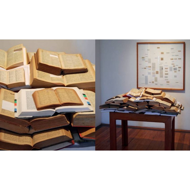 Cerca de 70 dicionários de diversas épocas e idiomas dos quais foi retirada a palavra “Liberdade” – apresentação sobre mesa de madeira