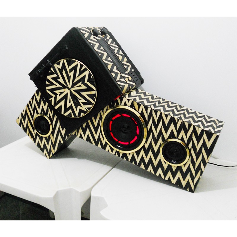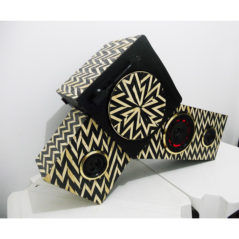 | Especificações Técnicas / Technical Specifications | Laminado de madeira pintada. Marchetaria sobre aparelho de som 3x1 |