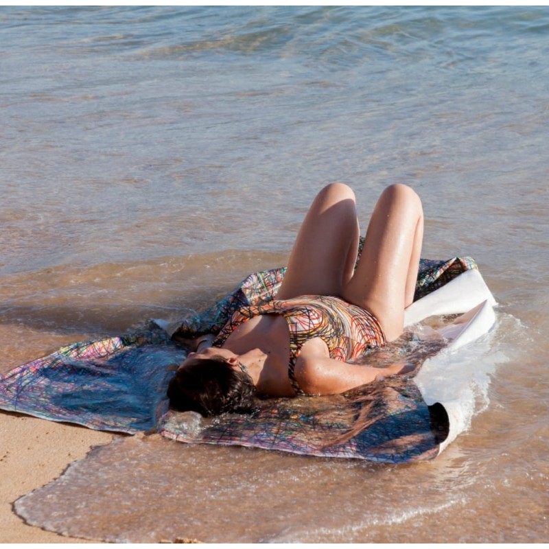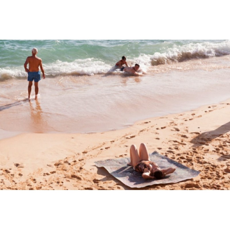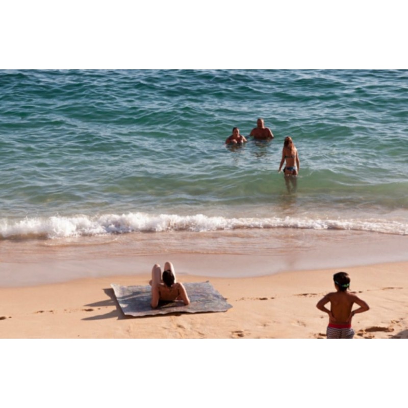 Chego à praia (vestindo o fato de banho usado em Mergulho e Tribuo) com o desenho debaixo do braço (enrolado para dentro), na areia desenrolo-o, deito-me sobre ele, apanho sol, vou mergulhar no Atlântico, seco-me sobre ele, vou de novo à água. E assim vou repetindo este ritual durante 5 dias. No último dia escolho um lugar mais perto do mar e deixo que este nos envolva. Deixo-me ficar em cima do desenho até me cansar das ondas. Levanto-me, afasto-me e fico de longe a observar.