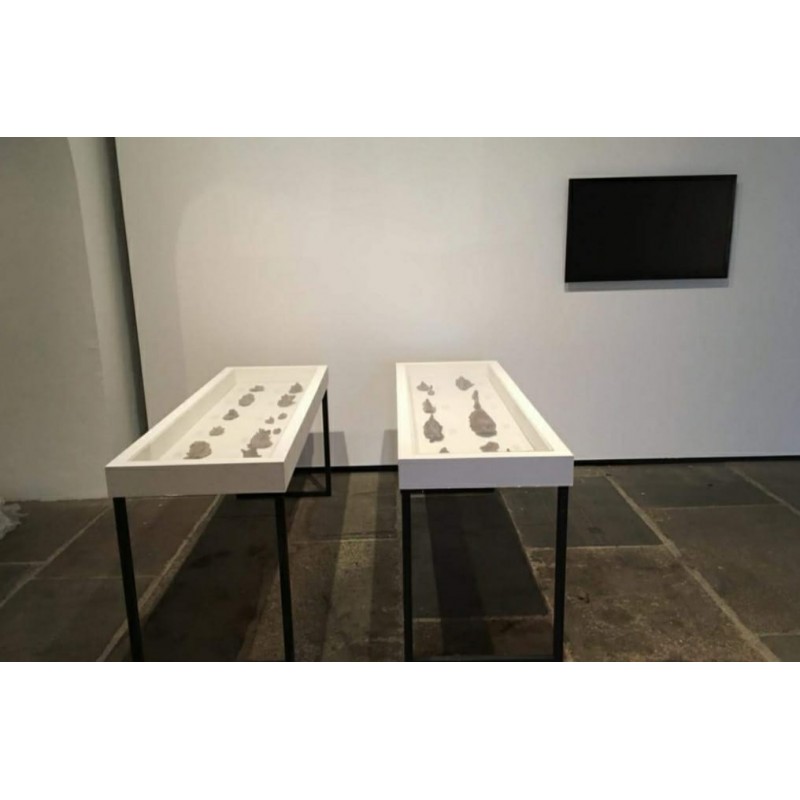 Video + esculturas em pasta de casca de bambu e aparas de lápis em vitrines